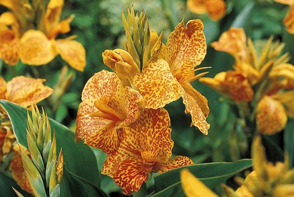 sytě žlutá s červenými tečkami a skvrnami, bohatě kvetoucí osvědčená odrůda, zelené listy, výška až 100 cm