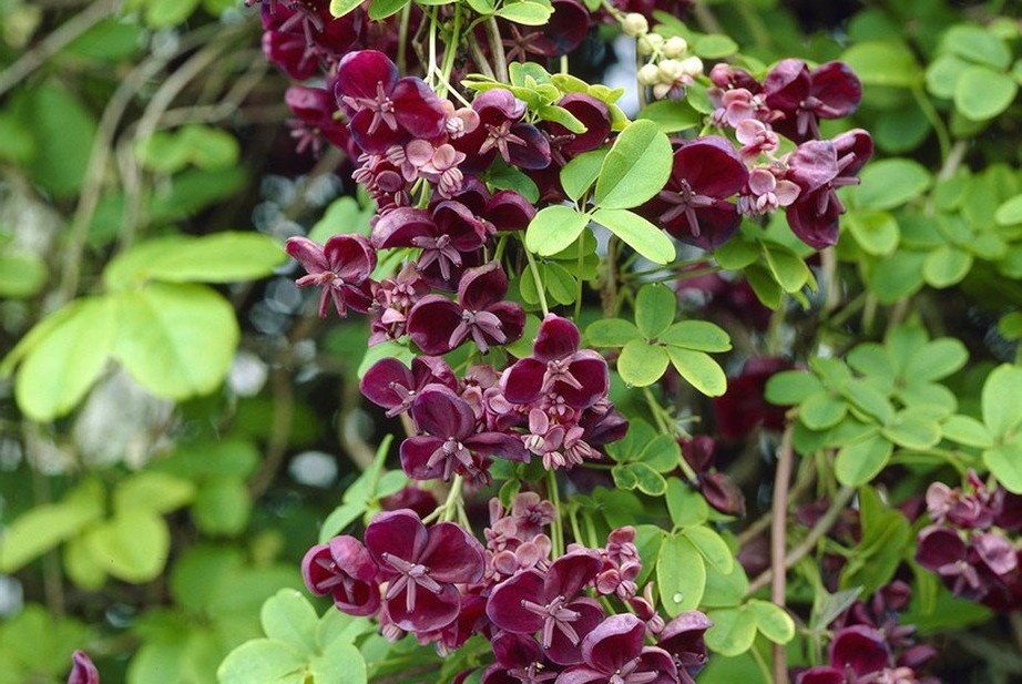 akébie pětičetná je ovíjivá rychle rostoucí popínavka dorůstající výšky až 8 m, opadavé nebo částečně stálezelené dekorativní listy, květy jsou fialové, sladce vonné po čokoládě, výborná na pergoly, silná vyvazovaná sazenice výšky 30-40 cm V 11x11