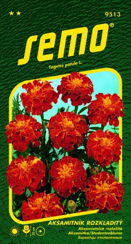 Aksamitník rozkladitý (Tagetes patula) Carmen. Bohatě kvetoucí letnička s aromatickými listy určená na záhonové výsadby, obruby, do okenních truhlíků a ozdobných nádob. Nenáročná na pěstování, bohatě kvetoucí po celý rok.
