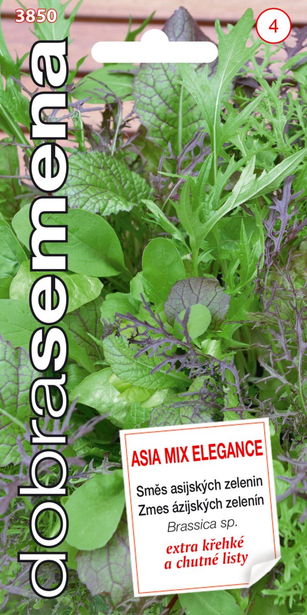 Směs asijských listových zelenin i ke sklizni mladých listů, pro "baby leaf". Vhodná pro pěstování na záhoně i v truhlících. Vysévejte na široko nebo do řádků, nahusto, až 100 semen na metr řádku. Rostliny rostou rychle a sklízet můžete 30 až 40 dní po výsevu. Balení 4 g.