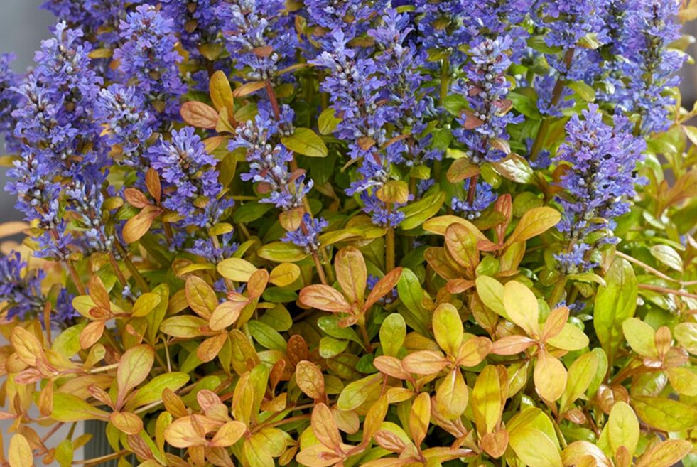 s netradiční žlutooranžovou barvou stálezelených lístků, plazivý pokryvný růst do výšky 10 cm, vhodnější do polostínu, modré květy zjara, sazenice v K 9 cm